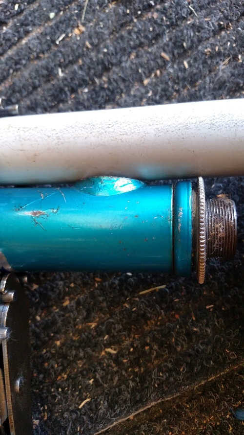 This was because the crashed wheel was very very out of tru (no longer consistently round). Initially I thought I would just weld the steerer tube to the long section of tube but this proved impossible as it would have impeded the rotation of the fork.