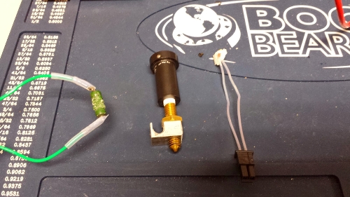 Once we got the X/Y/Z motion working again, it was on to the problem of the extruder nozzle (known as the "hot end") not heating up. I wasn't sure if the problem was the hot end itself, or some other problem. The temperature sensor was working, and was showing the correct temperature. I unplugged the heater leads and confirmed that there was voltage going to the hot end, so that had to be the problem.