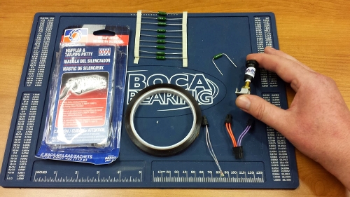 6.8 ohms, 3W, They were cents apiece. We bought 10. A few other things we bought were some high temperature wire, PTFE insulation, and some new connectors. I chose not to try to salvage the old connectors or wiring, since it was quite easy to reconstruct that whole setup. Keep in mind when working with these, that everything needs to withstand some pretty high temperature. The putty that used was muffler putty used on car exhaust systems, it's good up to 500ยบ C
