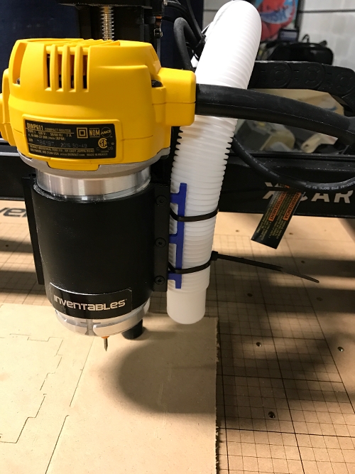 Having a CNC Router is awesome. Having to constantly clean up shavings is not. To more cleanly operate the X-Carve we decided to go ahead and print a dust shoe to attach a vacuum to. This would allow us to suck up all the shavings and dust as the machine operates and keep the work space cleaner. Searching online we found a design that could be easily printed and attached to the spindle. However, once we printed it we had concerns that the shape of this part would interfere with clamps and thus reduce the overall cutting area we had access to. Considering this, we decided to design our own system for sucking up the mess.