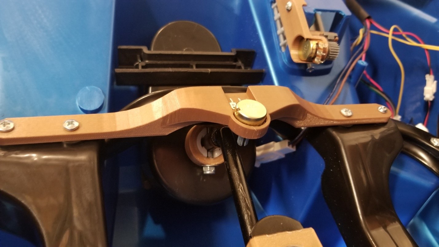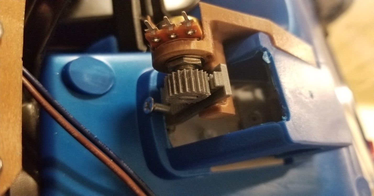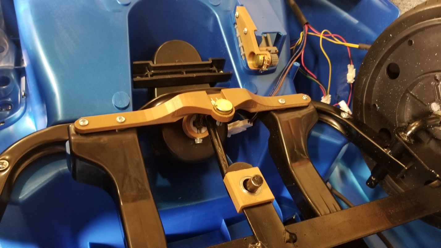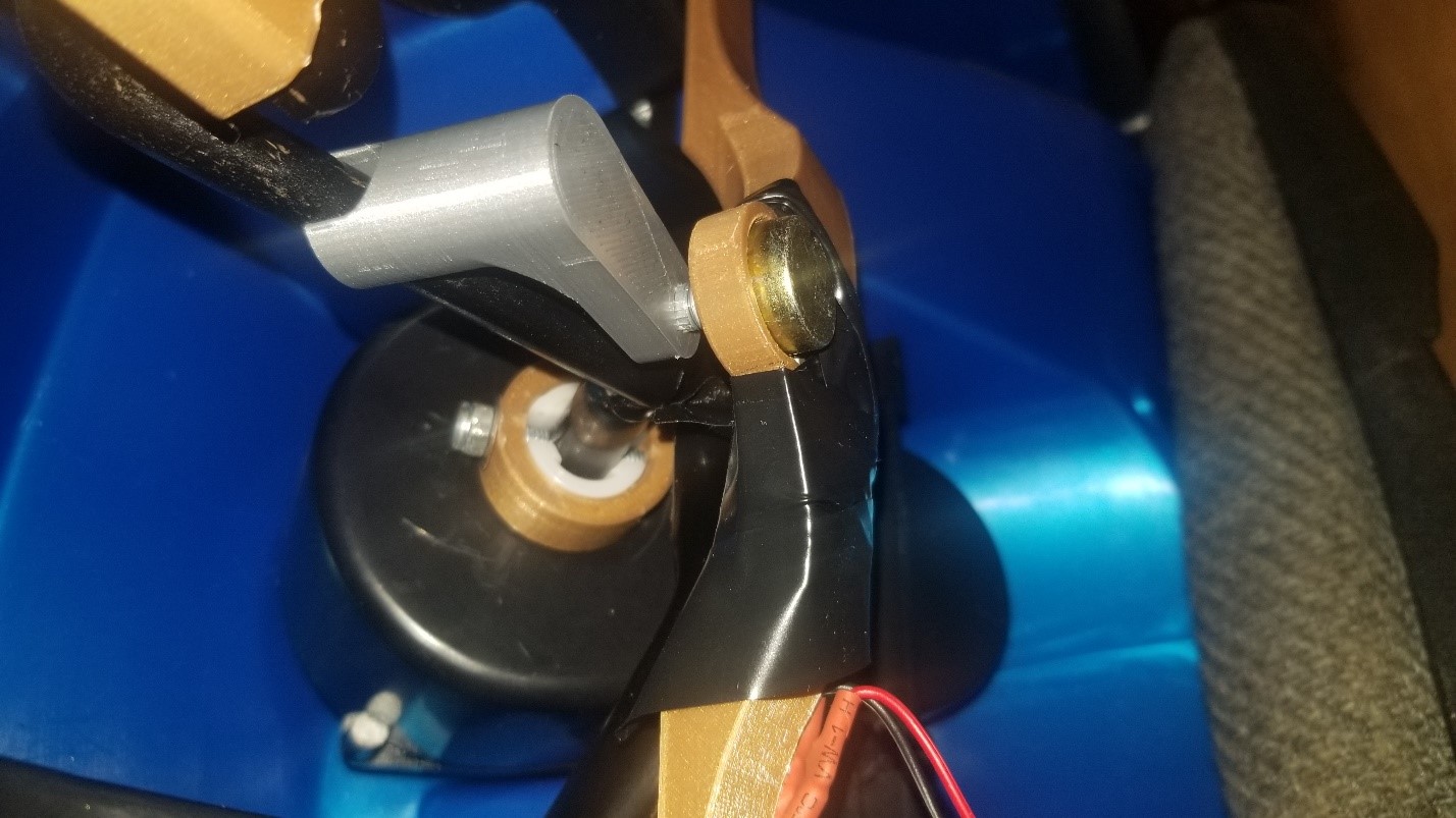 3D printed steering arm pressed onto steering potentiometer, resting around steering linkage