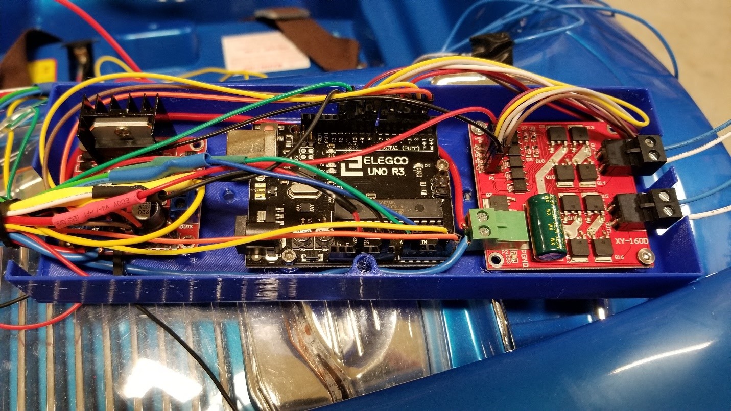 Components installed in electronics box (updated installation moves on L298 H-bridge to 2nd level)