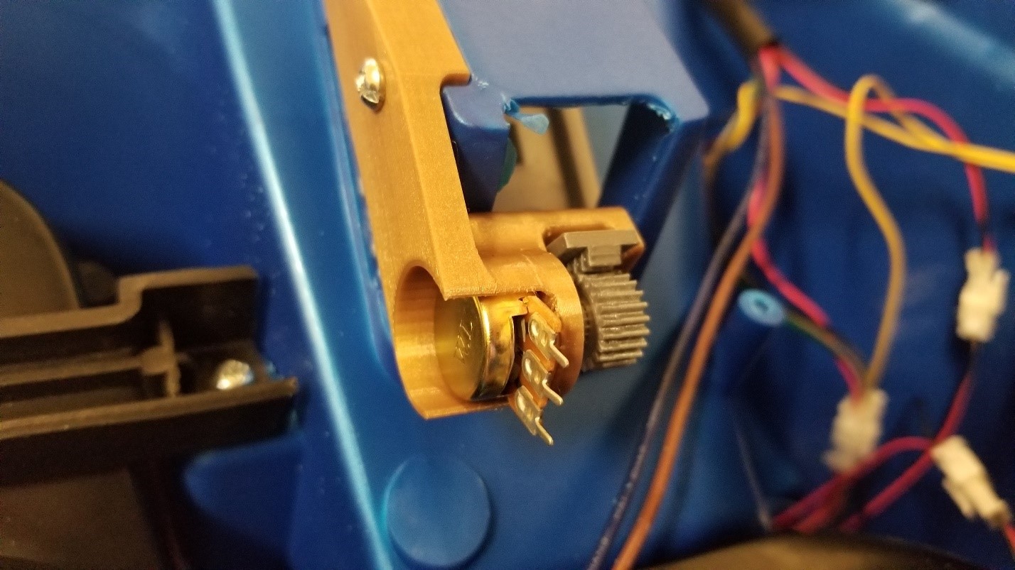 Final gas pedal prints installed. Gear is installed onto the potentiometer with throttle arm pressed against it. The mounting bracket is bolted directly into the car chassis. A stop screw was installed to have a constant limited travel so there would be constant values to the Arduino.