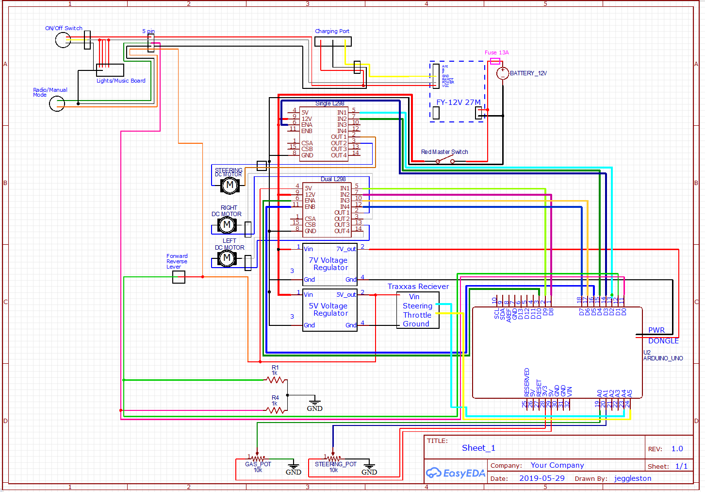 L298 dual Hbridge controller – Used for forward/reverse function of drive motors as well as left/right function of steering motor.