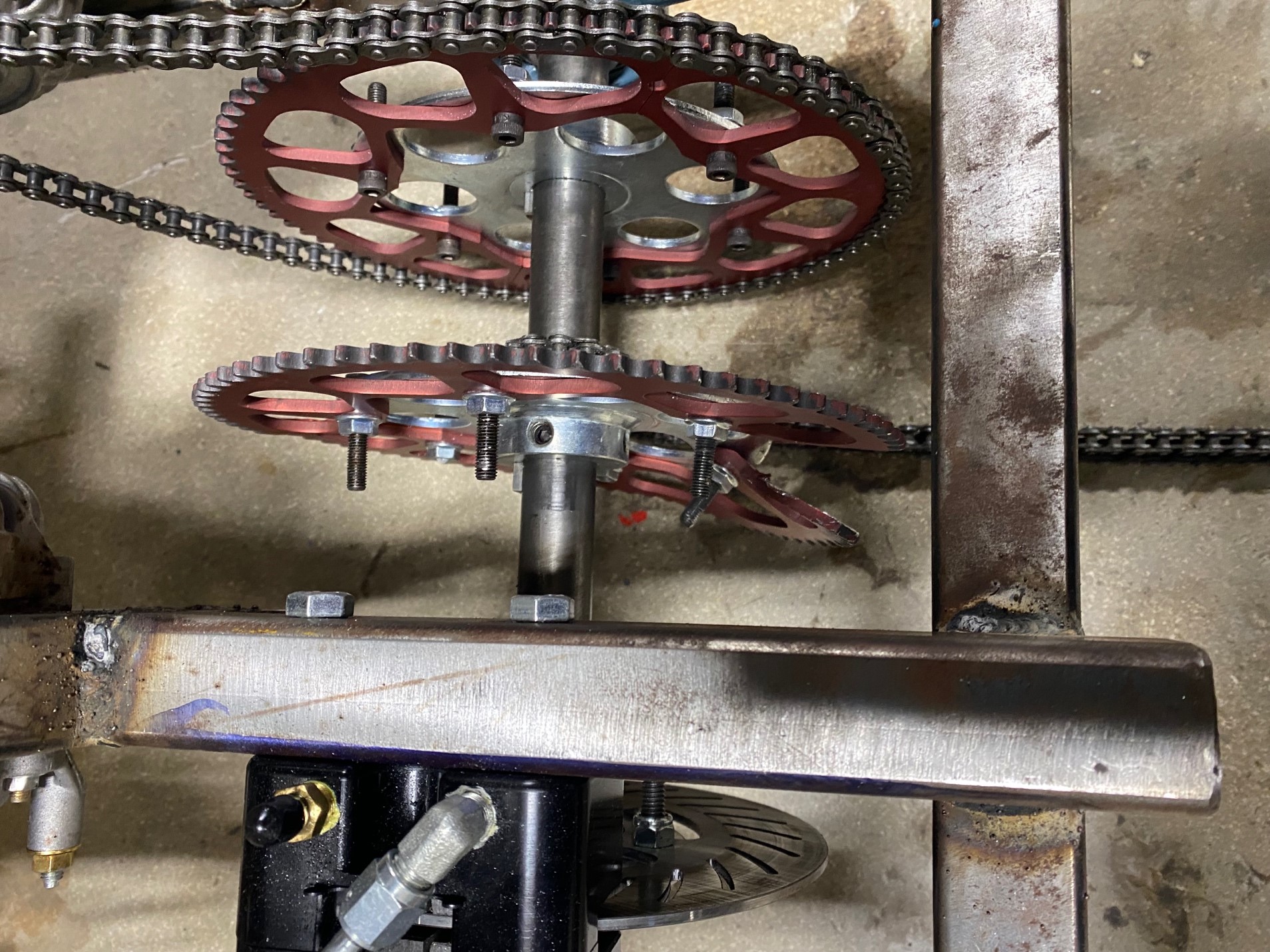 While we were able to get both motors running and get the kart running off a single motor, not long into testing it decided to throw a chain and eat one of its sprockets. This happened because of the twin motor drive train, when the chain slipped off the sprocket of one of the motors the other motor kept on running. This caused the loose chain to bind and bend the sprocket before the user had even realized what had happened.