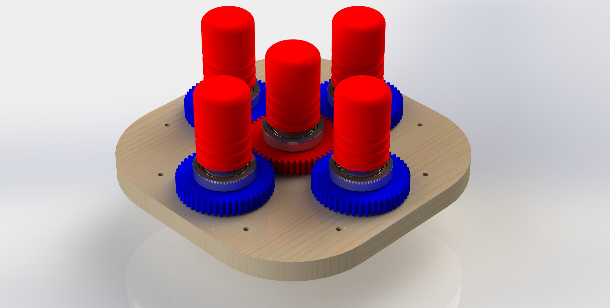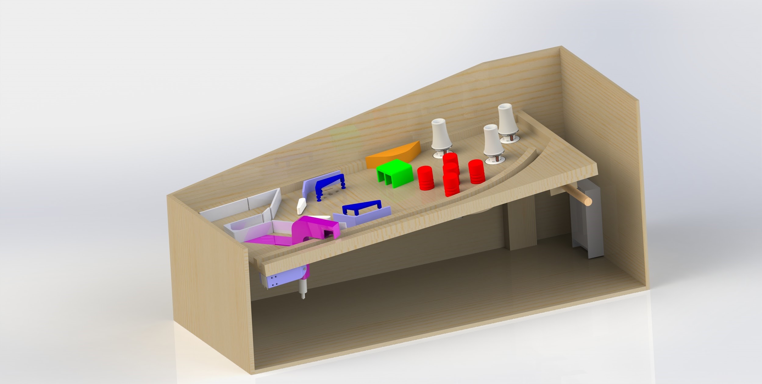 This week I worked on finishing up the play field designs. To finish off the play field I added the guides for the ball return system, designed the caps for the slingshots, laying out a twin tunnel obstacle to score points in, and designed a spinning pillar obstacle that uses a gear box and one motor to spin five pillars and fling the pinball all over the board. To simplify my design process of the gearbox a little bit I was able to find gears of the right diameter on McMaster-Carr, download the model and then tweak the model to fit my needs. The beauty of it is I have gears where I know the critical dimensions are correct and I can now 3d print them and have the shaft keyway customized to something that better fits my design.