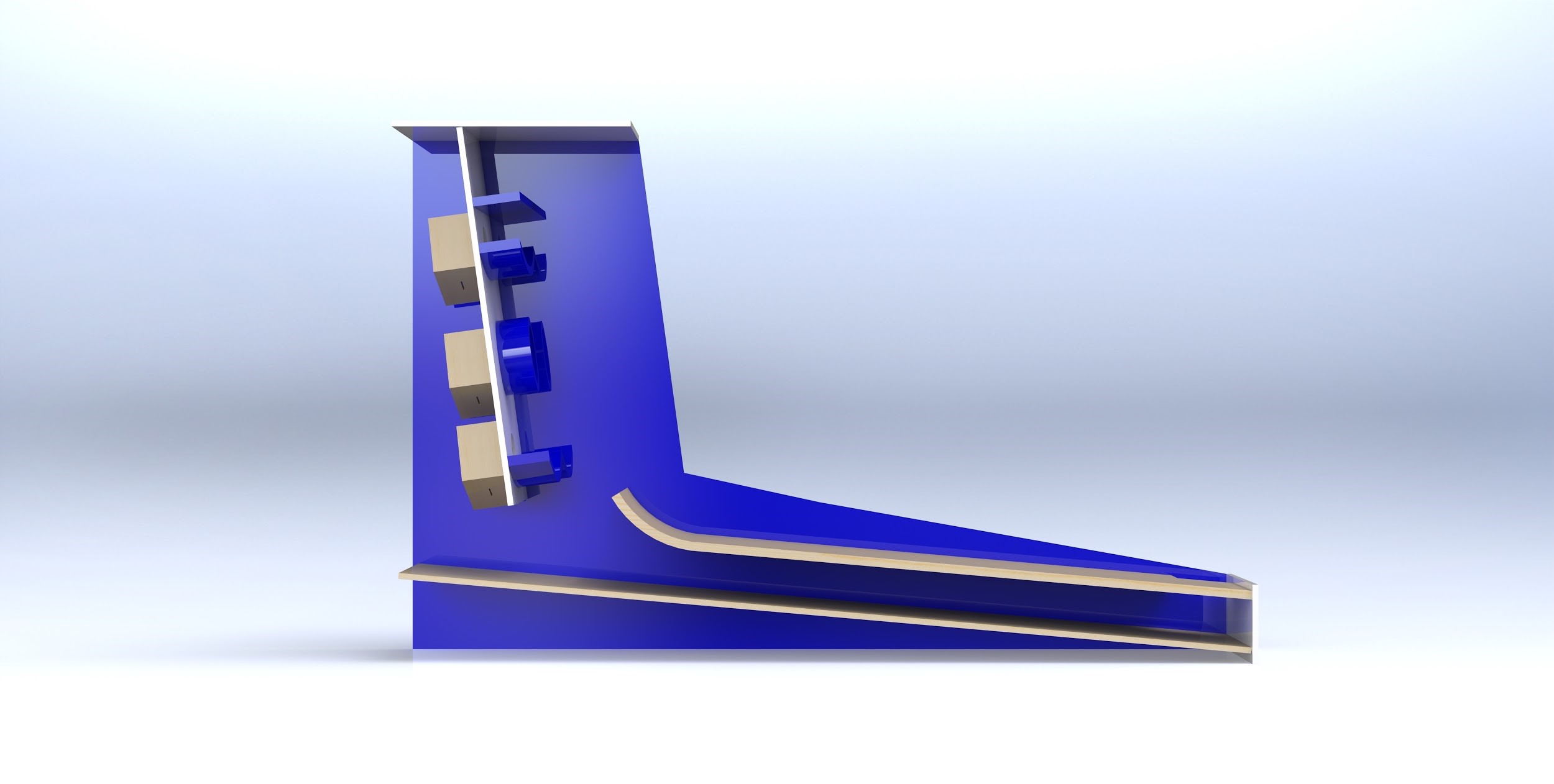 2. Between the ramp and return layer on the actual machine there is a funnel system made of a couple pieces of 4in wide plywood that just guide the balls to the retrieval hole. This was left out of the model as getting the exact angles right in Solidworks and keeping the mates happy would have taken enough time that it just wasn't worth doing for something that does not need to be precise.